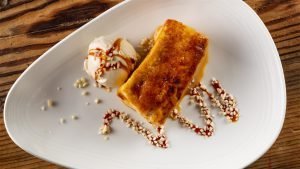 La clásica torrija reinventada con un toque caramelizado y acompañada de helado. Una explosión de sabores y texturas que te llevará al cielo de los postres.